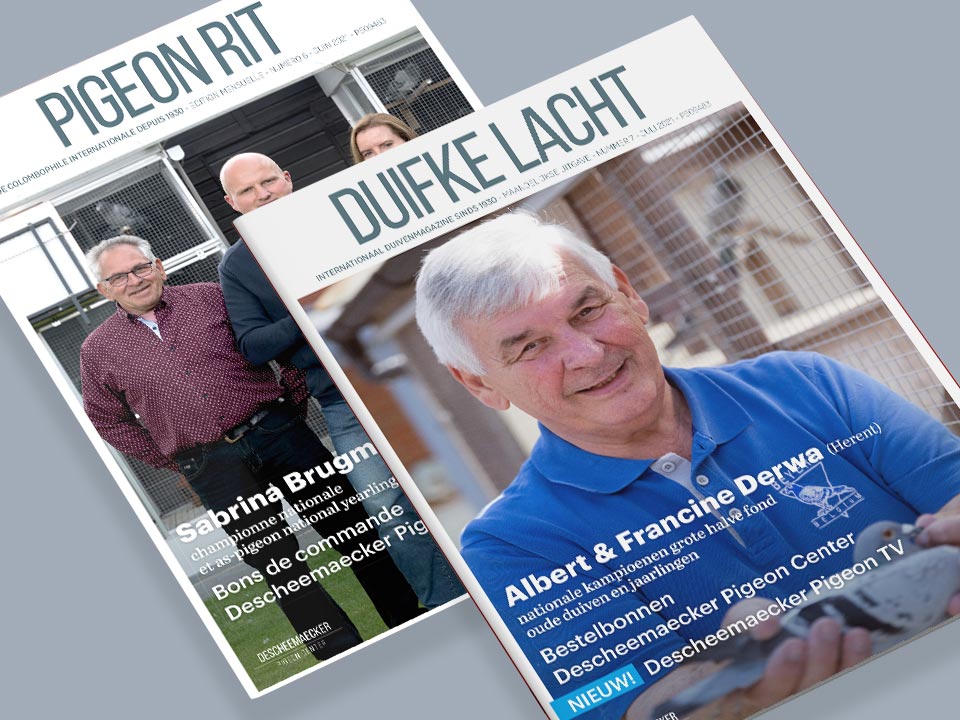With this magazine, available in Dutch and French, fanciers are informed 12 times a year about the ins and outs of the pigeon sport. The Descheemaecker Pigeon Center is the responsible publisher and is committed to continuing this activity in its current form and additionally digitally. The magazine will always be provided with professional visual material so that the pigeon sport comes into its own in word and image.